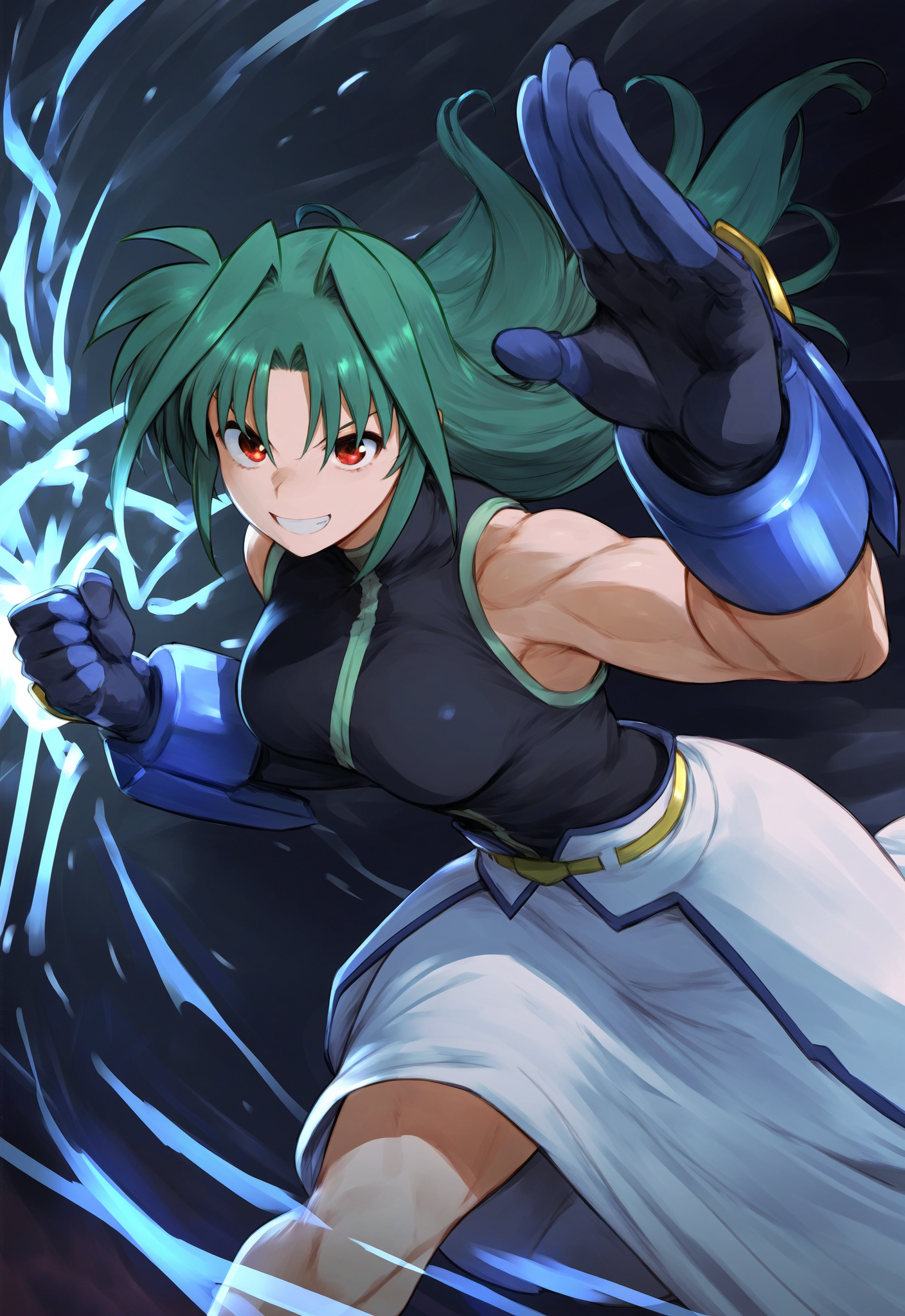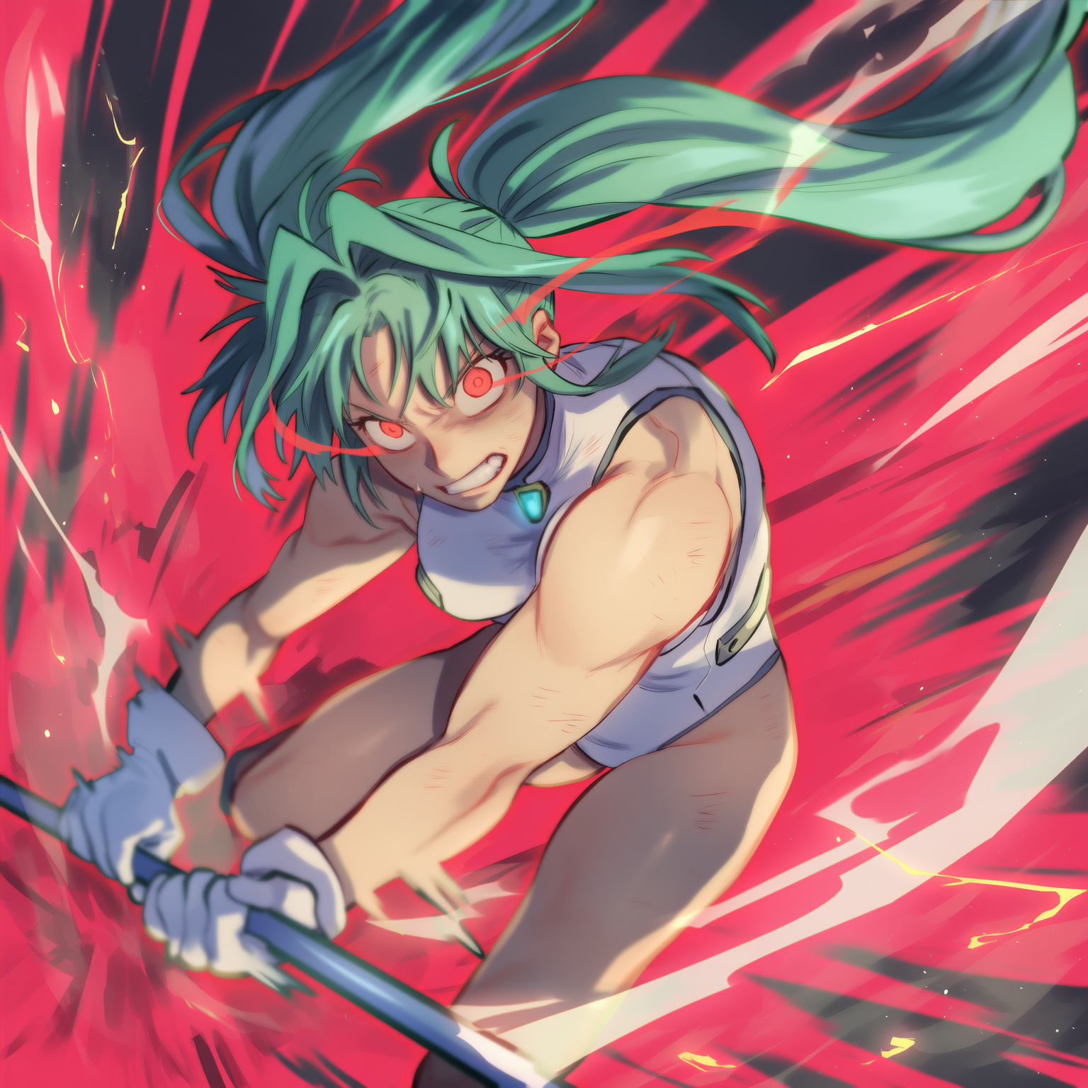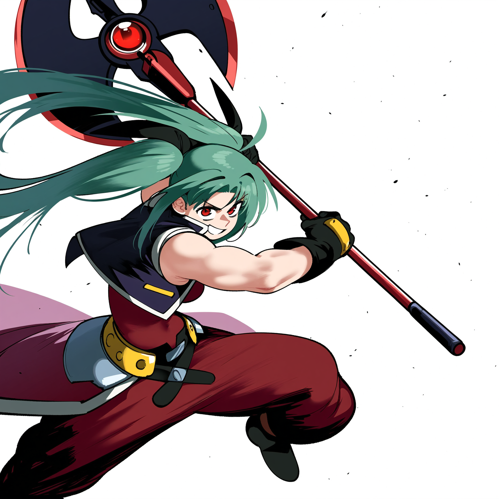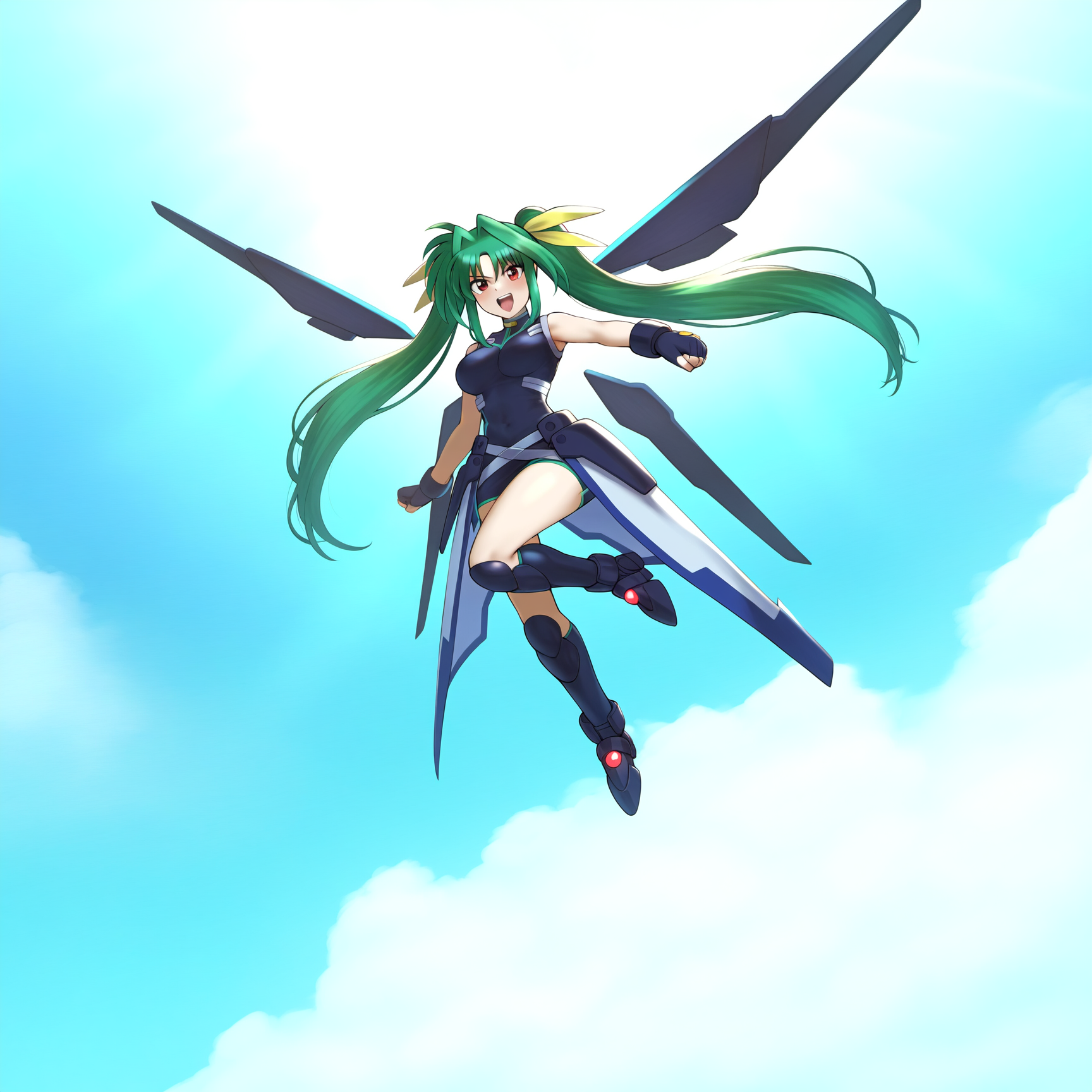 Her weapon is a mage's combat staff. It's properly suited for aerial combat against one or many flying targets.